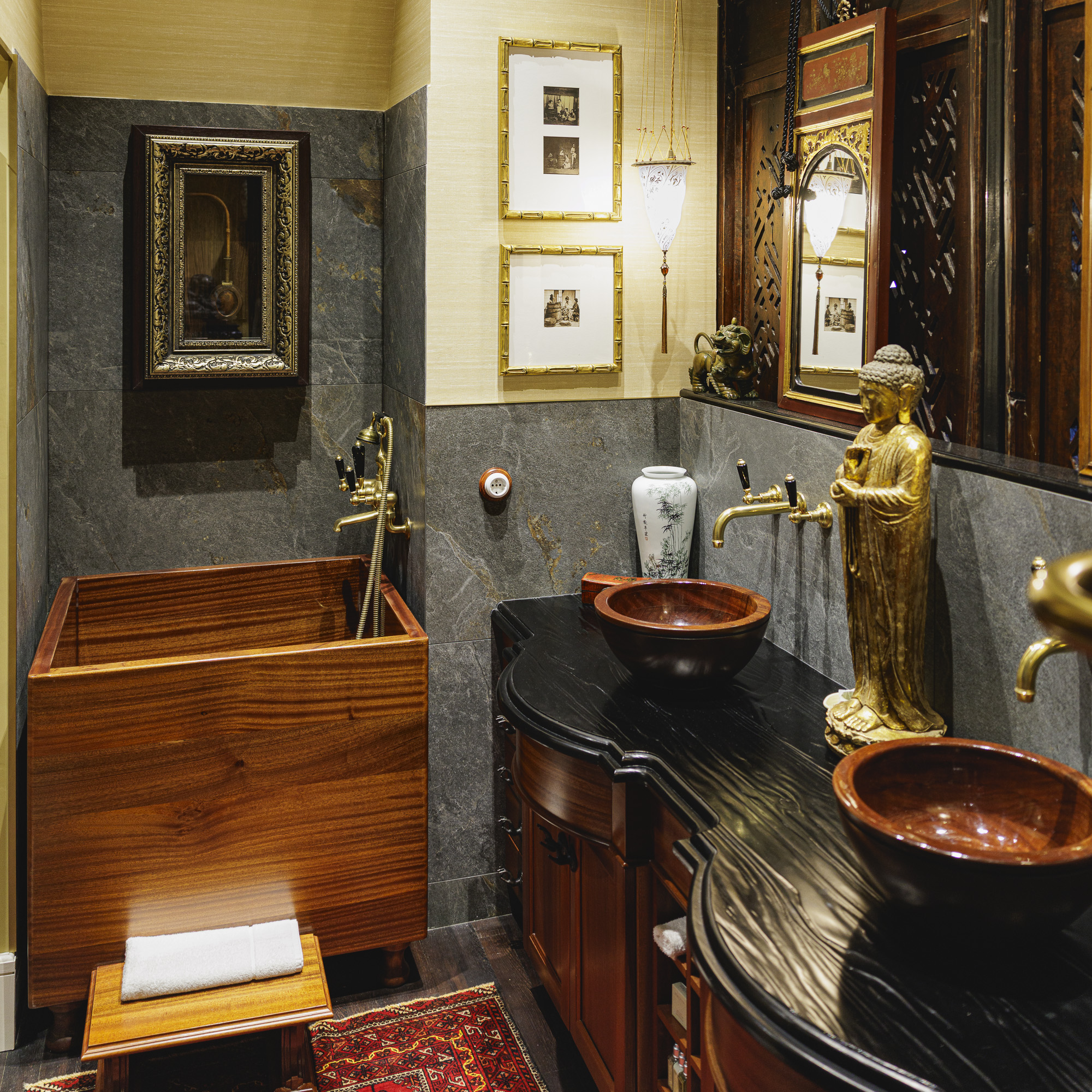 Step through its doors and you cross a boundary of time. Imagine the hush of imperial corridors. A side table rests like a memory, bearing a bronze incense holder crowned in pagoda spires. Watercolour women in flowing robes drift across the walls, while white blossoms unfurl upon the ceiling like breath. Wooden beams arch overhead—serene, symmetrical—as if holding silence in reverence.