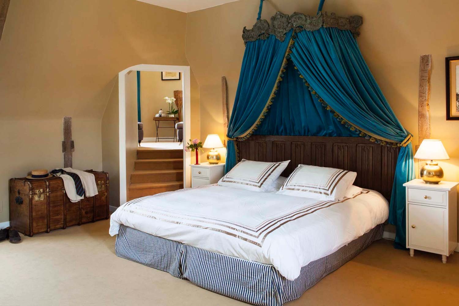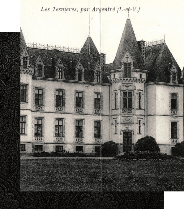 Tucked away in one of the most beautiful regions in the world, Château des Tesnières is situated on the border of Brittany, the Loire Valley and Normandy. The word tesnières refers to a place where there are badger burrows. Lords of this name are mentioned as early as 1196 in Torcé. Until 1609 two residences coexisted, Haute Tesnière and Basse Tesnière, which were then united by the Malherbe family. Previously, in 1513, Basse Tesnière, a house ennobled around 1436 by Duke Jean V, belonged to the Godarts and Haute Tesnière to Le Ludre. Subsequently, the Tesnières passed to the Guillaudeus (owners in 1637) and then to the de Langles (circa 1697)