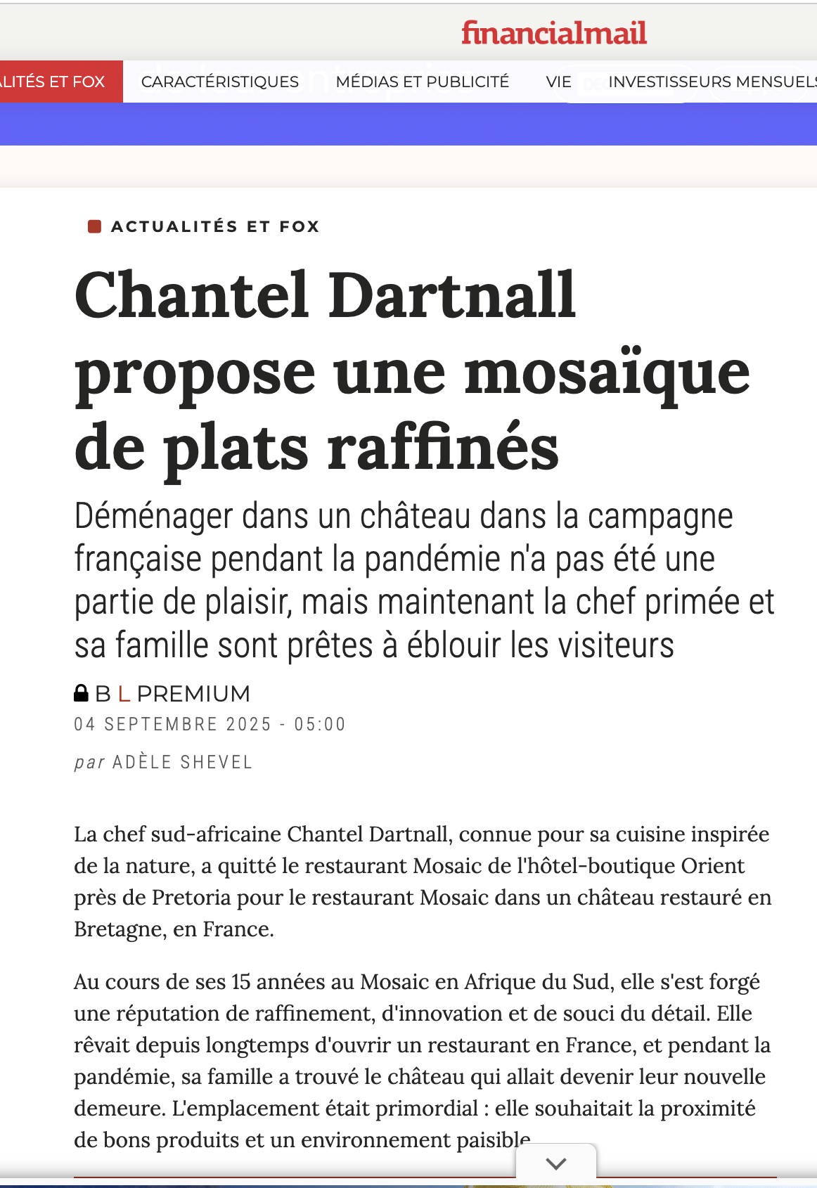 Le parcours de la cheffe Dartnall vers la France est le fruit de nombreuses années. Après s’être distinguée pendant plus de quinze ans à Restaurant Mosaic en Afrique du Sud, les familles Dartnall et Du Plessis ont découvert le Château des Tesnières pendant la pandémie — un lieu offrant à la fois un environnement serein et un accès privilégié à des produits locaux d’exception. Après une restauration complète, le Château a rouvert ses portes en mai 2025, accueillant ses hôtes dans un univers d’élégance discrète, d’art et d’excellence gastronomique.